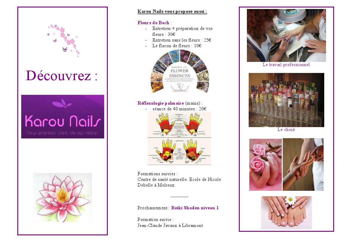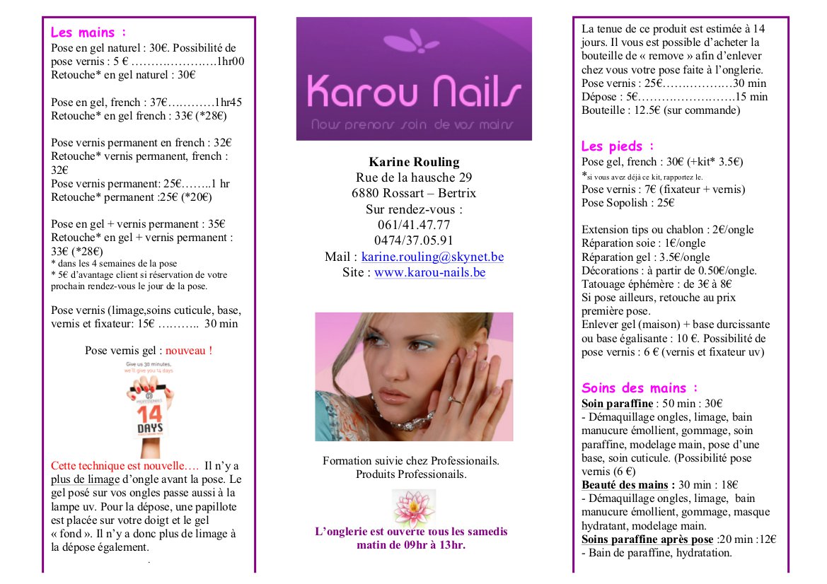 Les tarifs concernent: Ongles des mains, Ongles des pieds, Soins des mains, Soins des pieds. De nombreux accessoires et vernis sont disponibles dans l'onglerie.